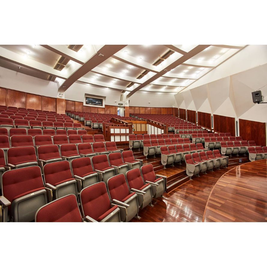 Con un diseño arquitectónico de estilo abovedado, el auditorio garantiza una acústica excepcional, incluso para presentaciones musicales o ponencias multilingües. Los asientos individuales están equipados con mesas de apoyo que permiten a los asistentes tomar notas cómodamente durante las sesiones.