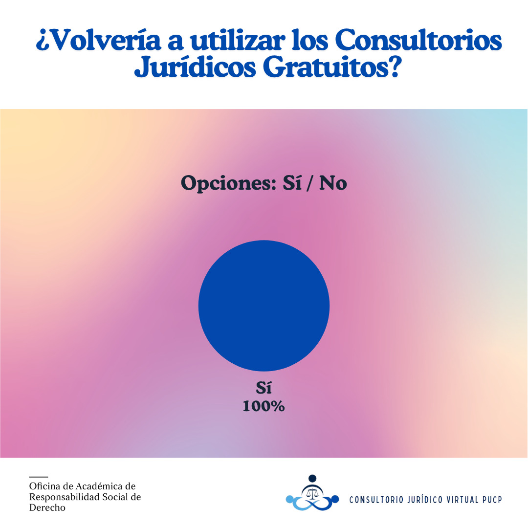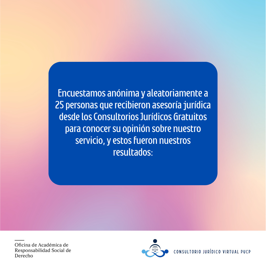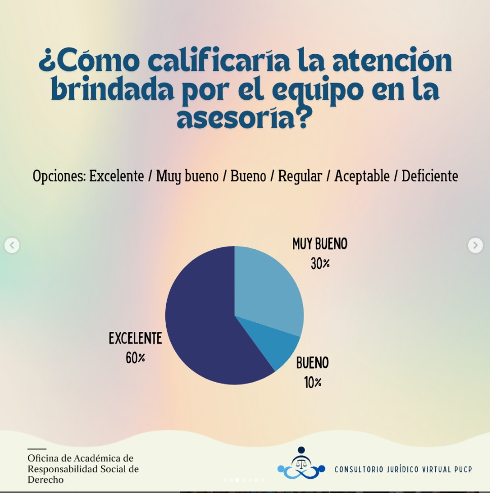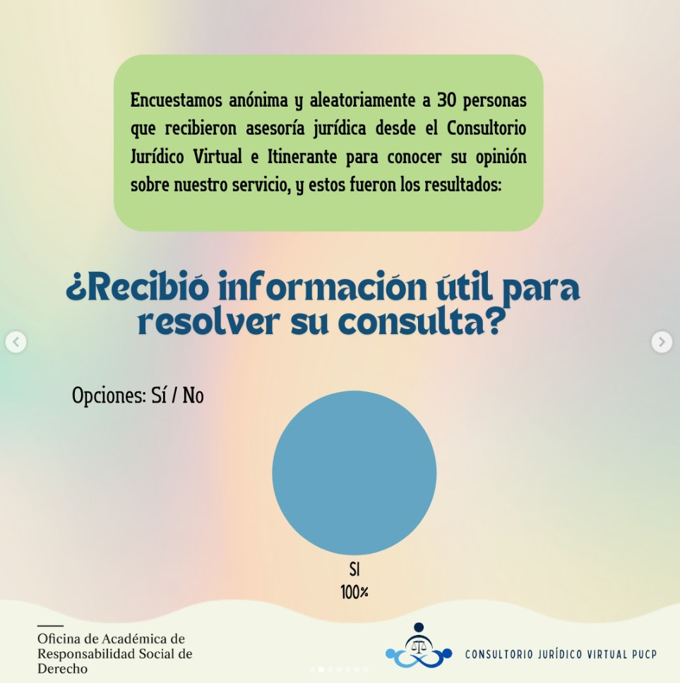 Un total de 30 personas seleccionadas aleatoriamente respondieron la encuesta de satisfacción. El 60% calificó la atención como excelente y el 100% manifestó que volvería a usar el servicio, destacando la utilidad y cercanía de la orientación jurídica ofrecida tanto en modalidad virtual como en espacios itinerantes.