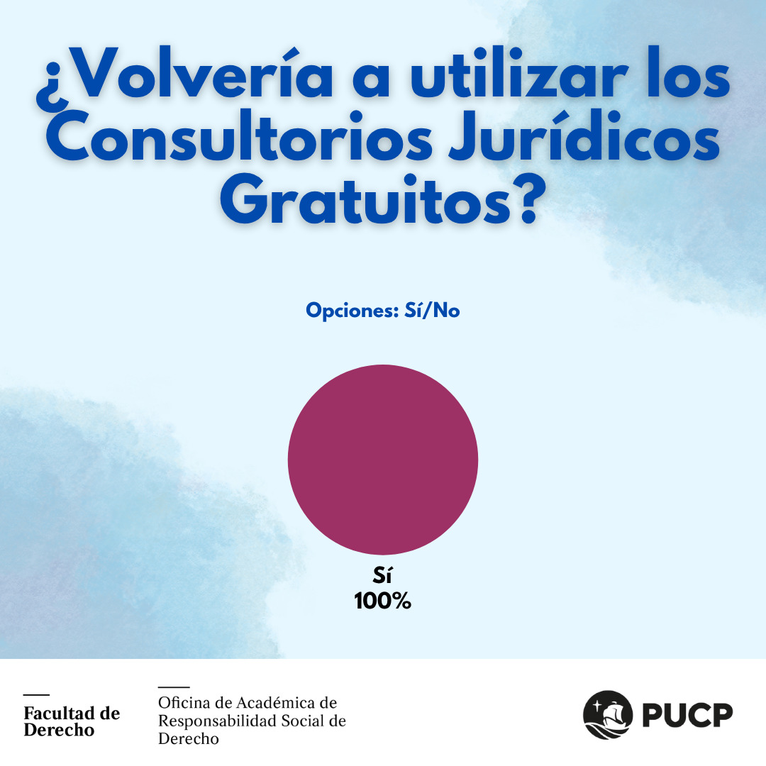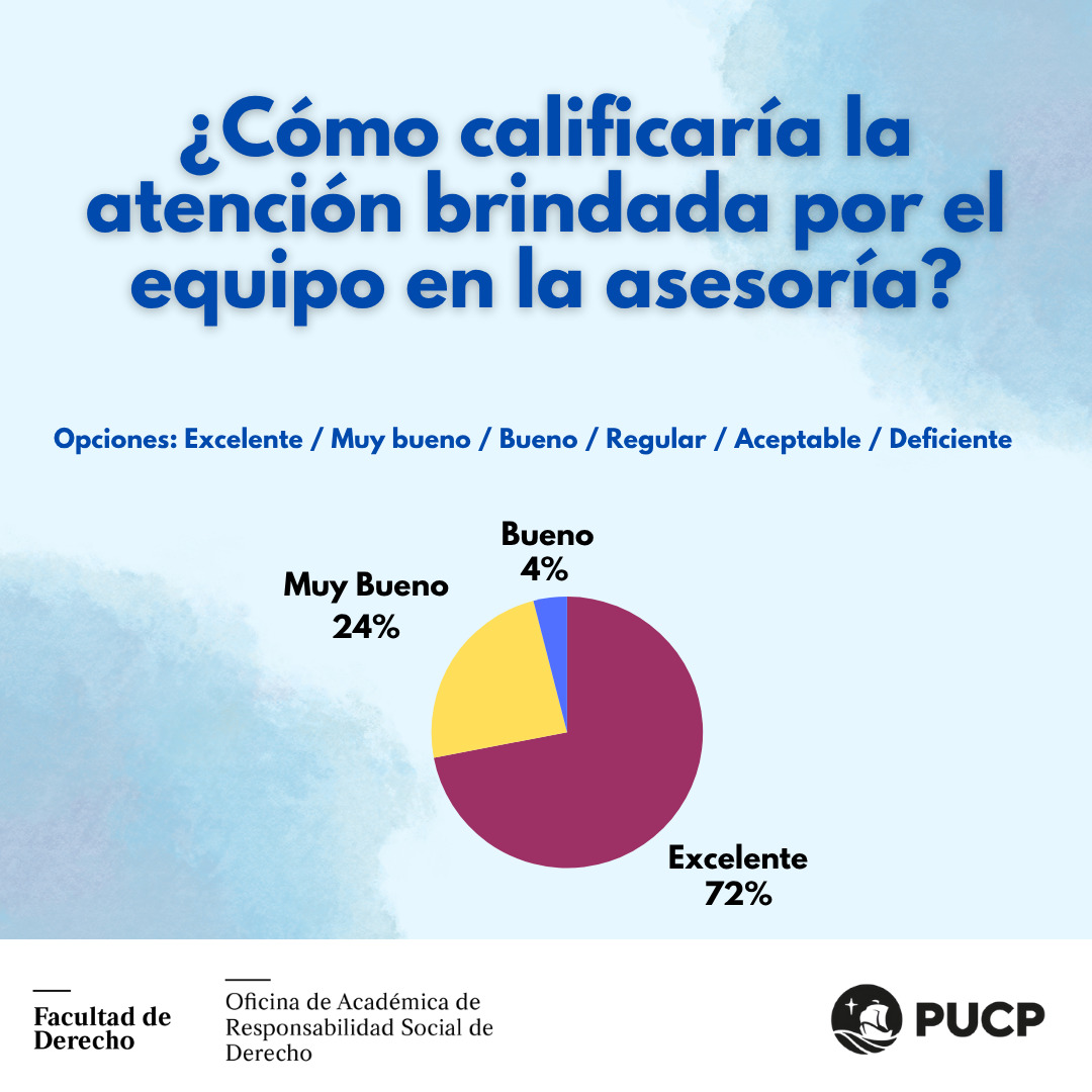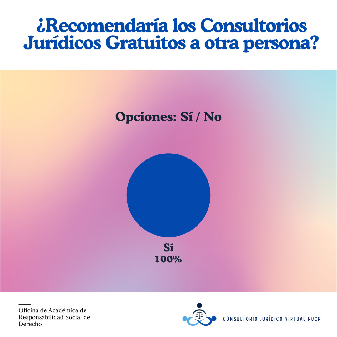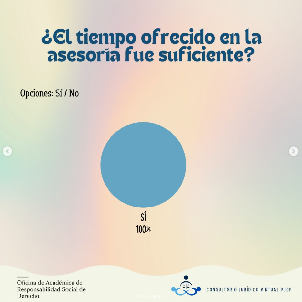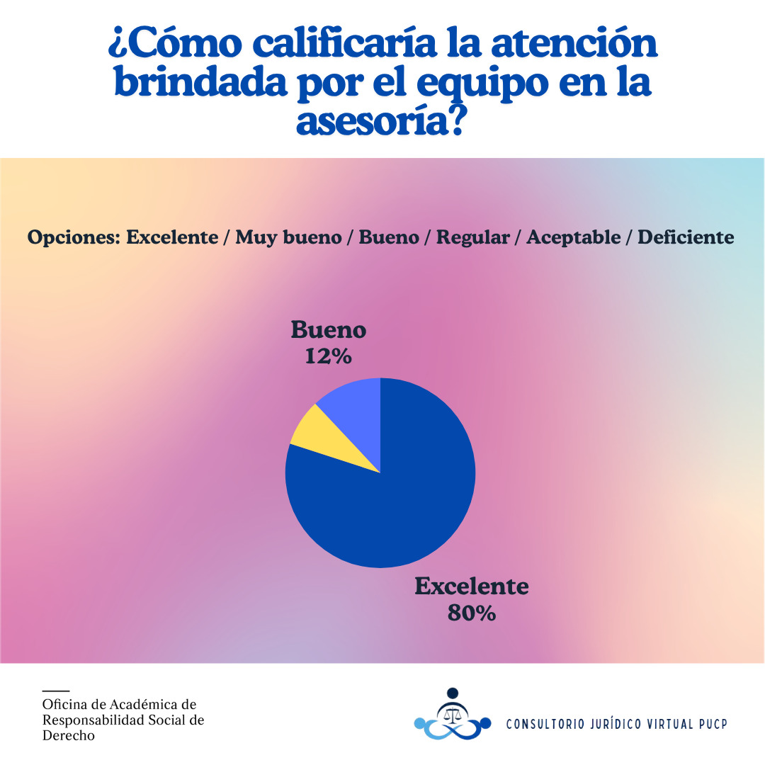 Un total de 30 personas seleccionadas aleatoriamente respondieron la encuesta de satisfacción. El 60% calificó la atención como excelente y el 100% manifestó que volvería a usar el servicio, destacando la utilidad y cercanía de la orientación jurídica ofrecida tanto en modalidad virtual como en espacios itinerantes.