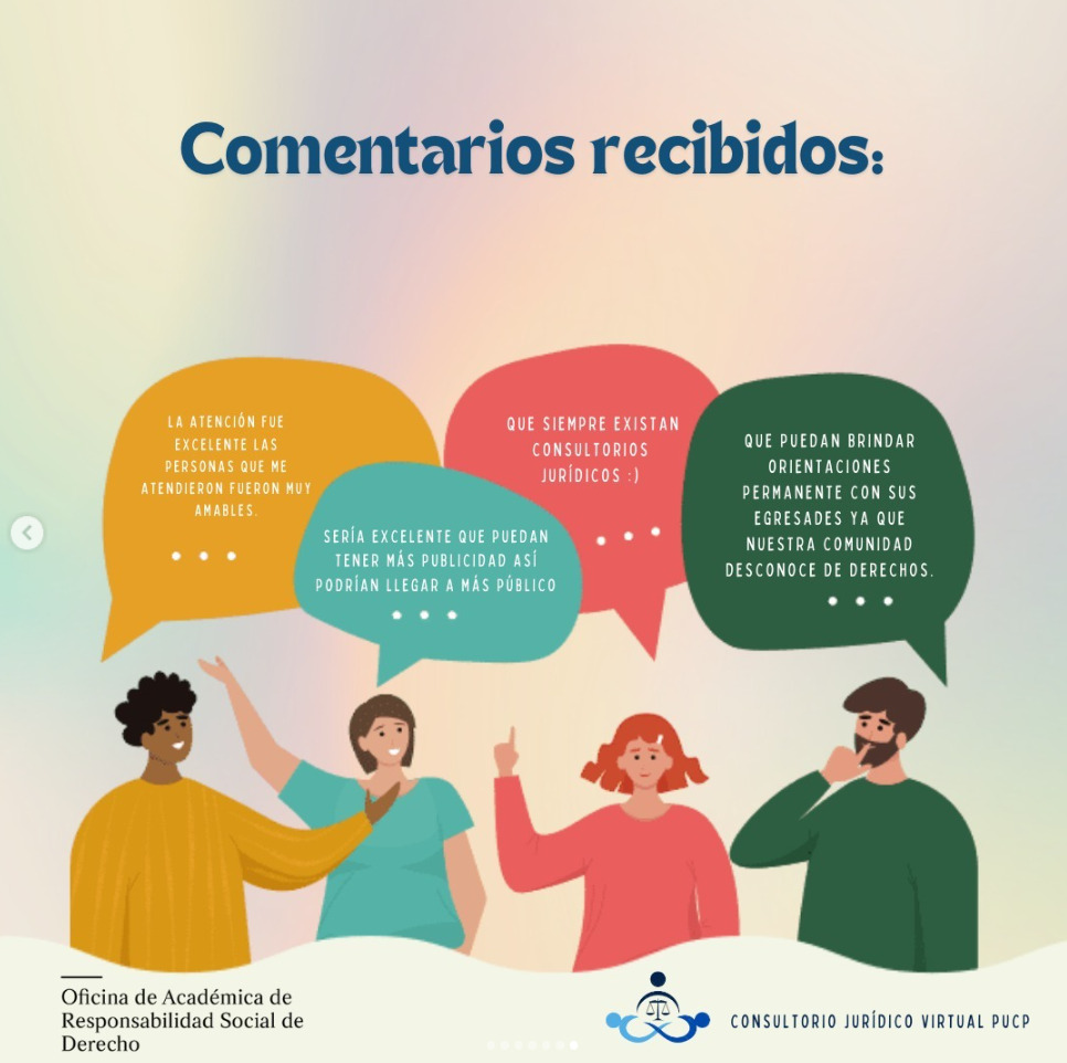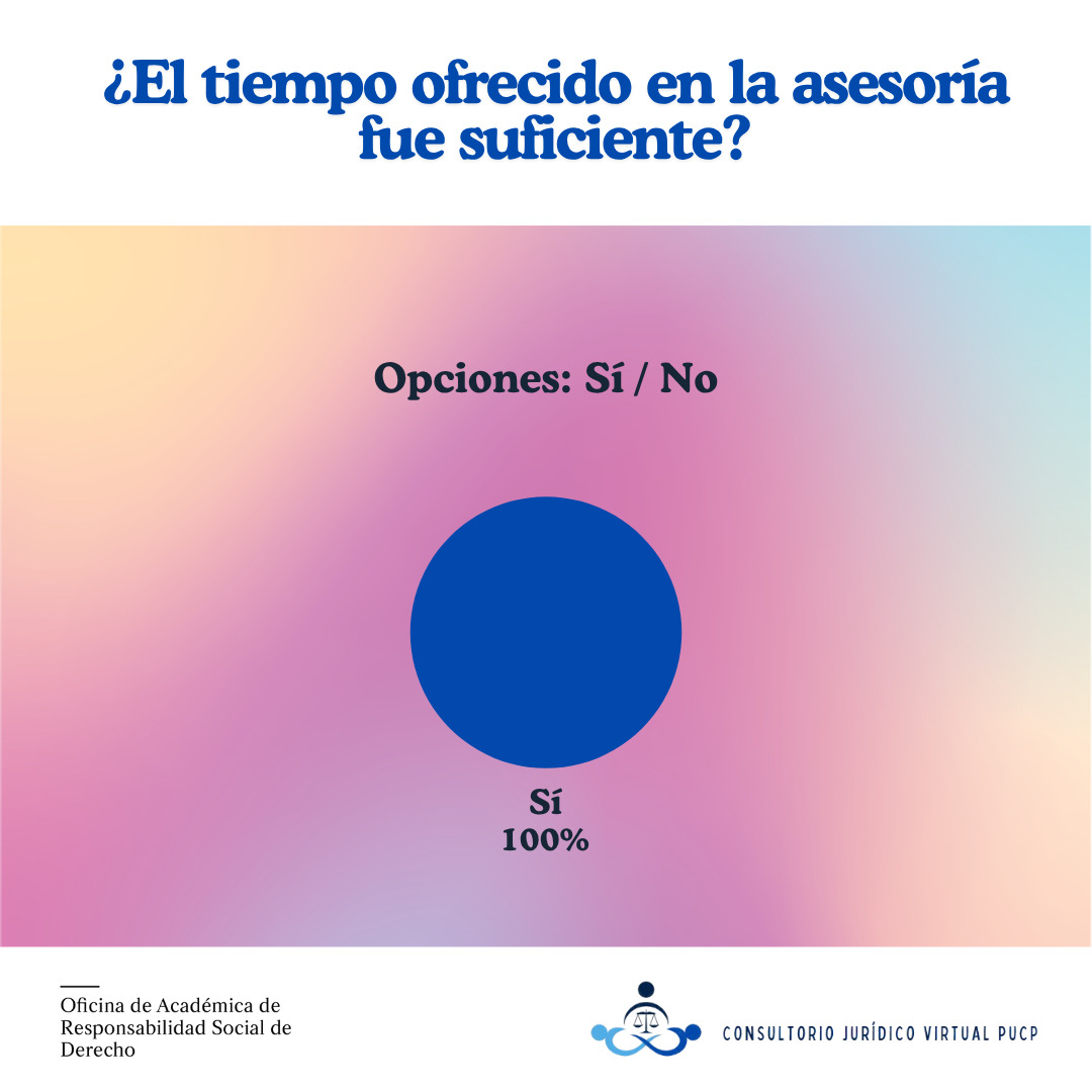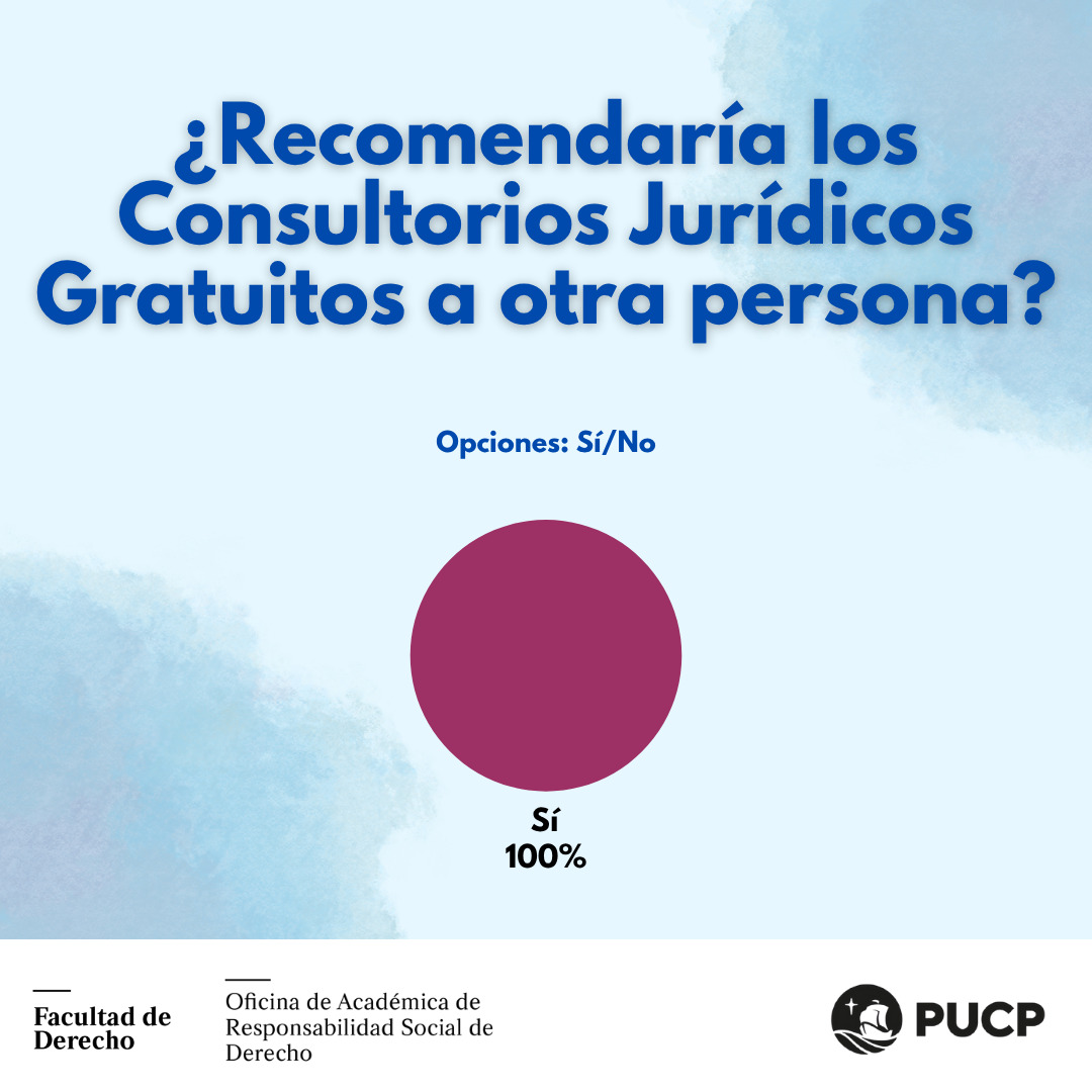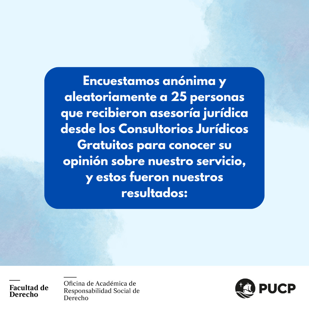Un total de 30 personas seleccionadas aleatoriamente respondieron la encuesta de satisfacción. El 60% calificó la atención como excelente y el 100% manifestó que volvería a usar el servicio, destacando la utilidad y cercanía de la orientación jurídica ofrecida tanto en modalidad virtual como en espacios itinerantes.