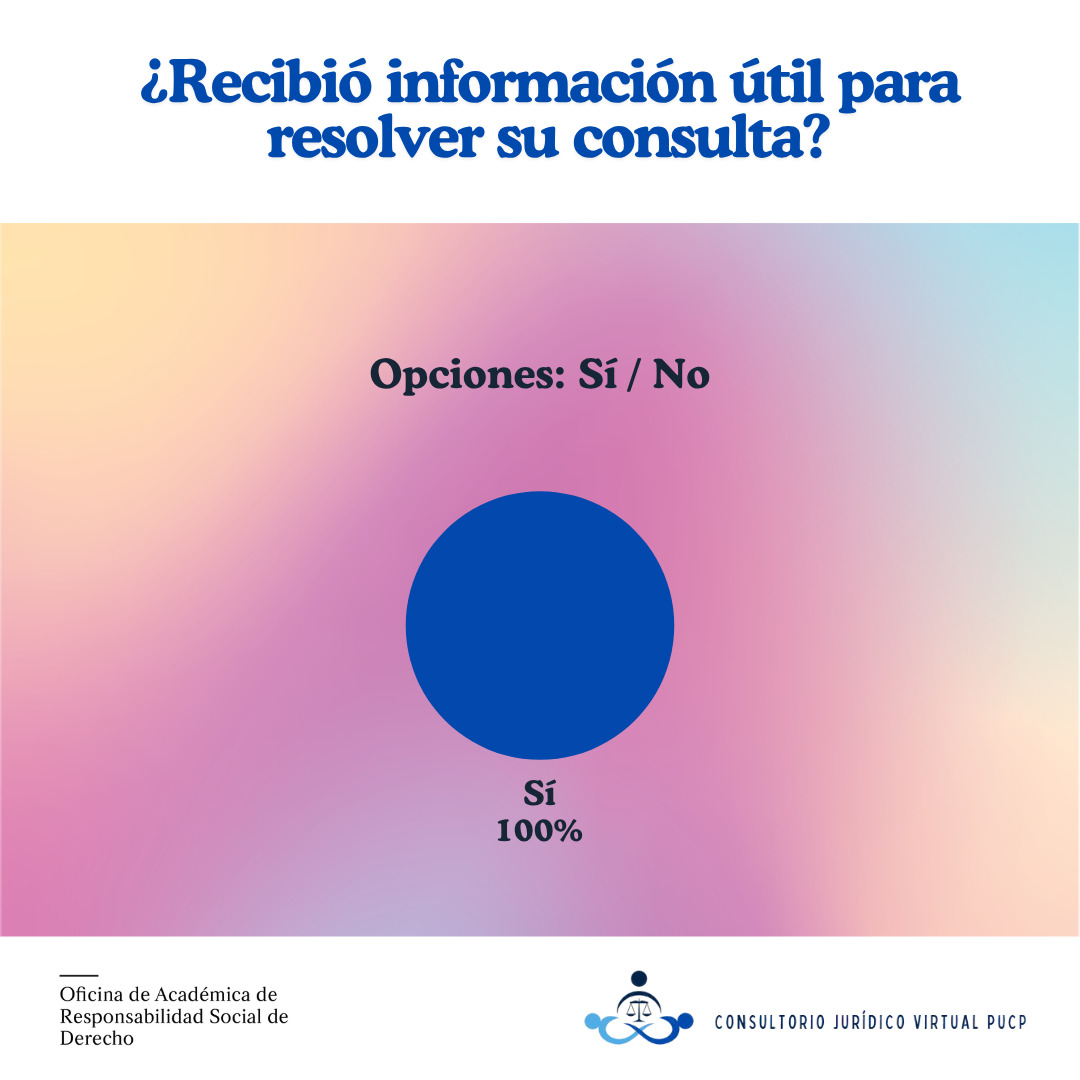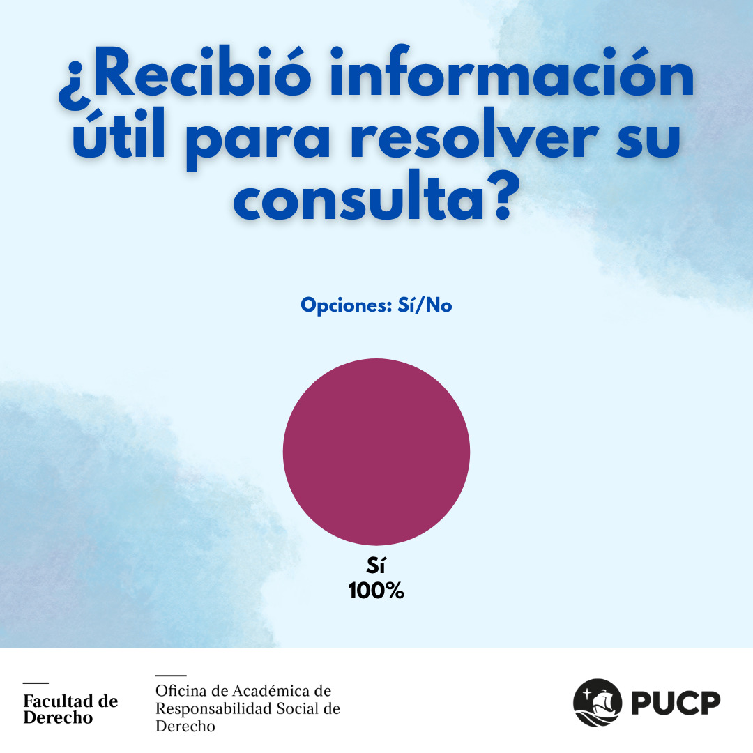 Finalmente, 25 personas respondieron aleatoriamente a la encuesta de satisfacción. El 100% indicó haber recibido información útil para resolver su consulta y el 72% calificó la atención como excelente, reafirmando el impacto y la calidad de la atención jurídica ofrecida en formatos virtuales, presenciales e itinerantes.