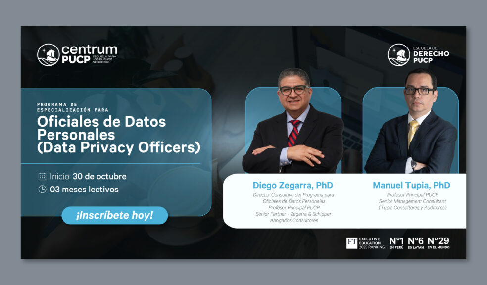 En un contexto en donde la protección de datos personales y la seguridad de la información se han convertido en temas de relevancia creciente en el ámbito nacional e internacional, la Escuela de Derecho PUCP y Centrum PUCP coorganizan el «Programa de Especialización para Oficiales de Datos Personales – Data Privacy Officers» (60 horas), bajo la dirección consultiva del destacado especialista Diego Zegarra, PhD; quien también conforma la plana docente junto a Manuel Tupia, PhD.